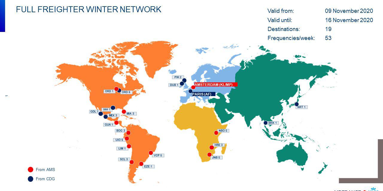 Air France KLM Martinair Cargo continues to increase the number of flights and destinations of cargo passenger belly aircrafts especially from Africa to Europe. Last week AF-KLM increased the number of worldwide destinations from 94 to 100, and weekly flights from 619 to 643, compared with last month. Increased frequencies were announced for Lagos eight times a week and Port Harcourt once a week for Nigeria, twice a week for Bouca in Central African Republic, 17 flights a week for Réunion Island, and 10 times a week for Guadeloupe.