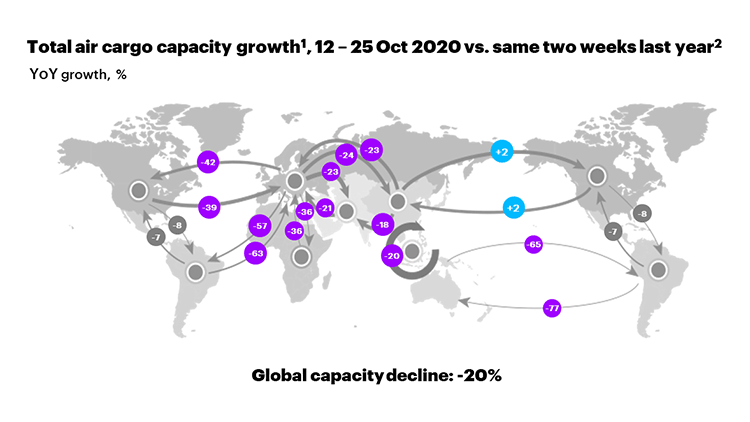 The second wave of the pandemic in Europe poses a new barrier for the already complicated airline industry. The new restrictions, with several countries in lockdown, are again affecting the economy in European countries, and will certainly have an impact on products required by the hospitality sector. For the moment there is no visible change in airfreight capacity compared with last month. According to the latest analysis by Seabury Consulting in mid-October, the reduced capacity from Africa to Europe remains at –36%, which is similar to the previous month.