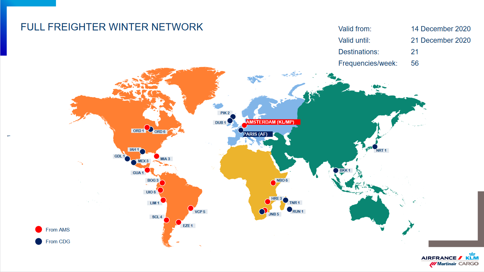 Air France KLM Martinair Cargo continues to increase the number of flights and destinations of cargo passenger belly aircraft, especially from Africa to Europe. Last week Air France-KLM increased its number of destinations worldwide from 100 to 105, and its weekly number of flights from 643 to 726, compared to last month. Increased frequencies to Africa were announced for Zanzibar and Dar-Es-Salam on Thursday and Sunday, but also to Lomé, Malabo, Brazzaville, Kinshasa, Antananarivo and Reunion.