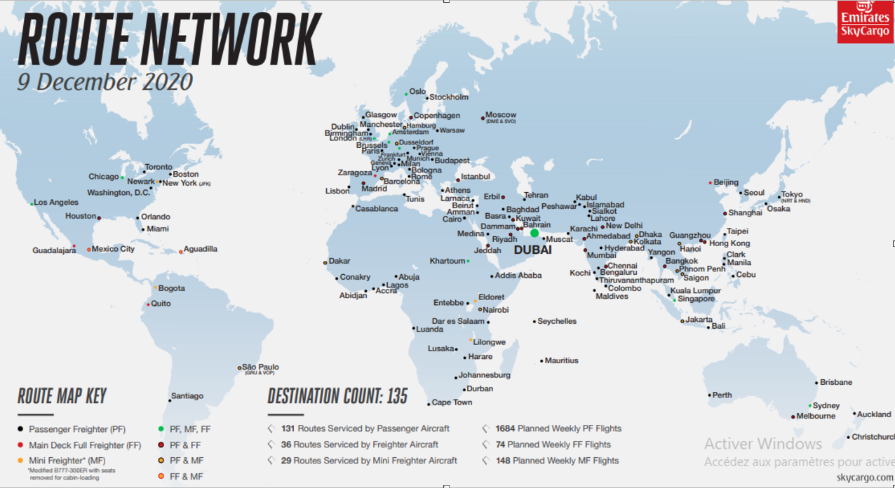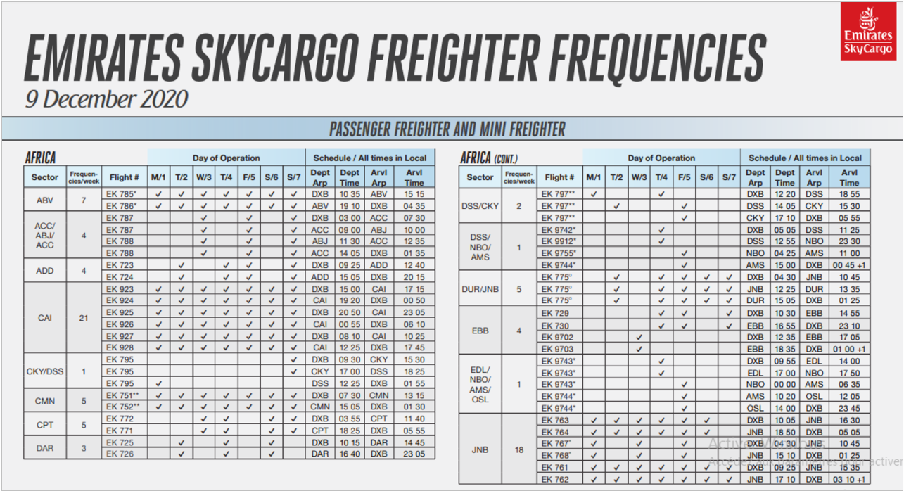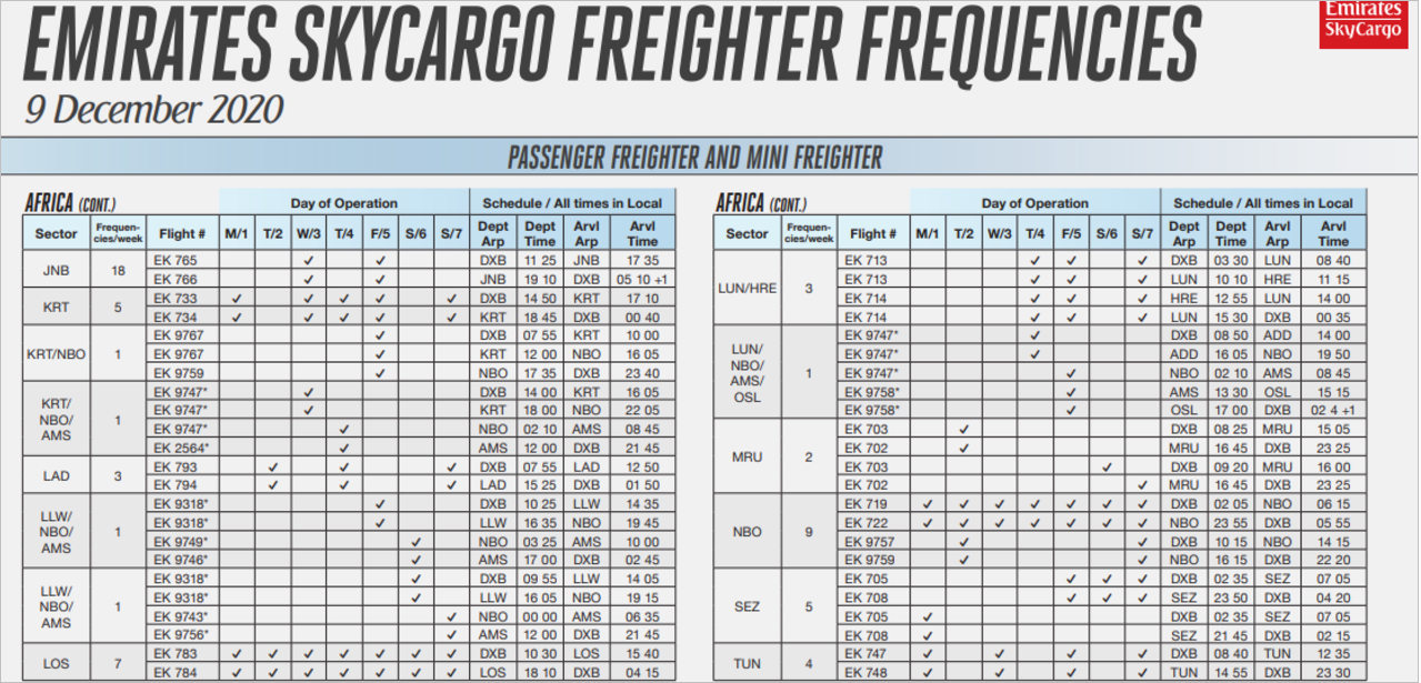 Emirates currently serves 19 countries in Africa, including: Angola, Côte d’Ivoire, Tanzania, Zimbabwe, Seychelles, Mauritius, Tunisia, Ghana, Egypt, Senegal, Guinea, Kenya, Uganda, Sudan, South Africa, Malawi, Zambia, with a connection in Dubai that relays with major airports in Europe including Brussels, Amsterdam, Frankfurt, Paris, London, Madrid, Zurich, Milan, Vienna and Maastricht. Emirates labour has been crucial in maintaining the flow of goods from African countries to 135 destinations worldwide.