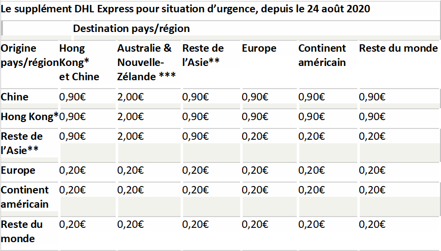 DHL: La suspension temporaire des services n’est plus effective pour la Guinée-Bissau, mais les délais de livraison prolongés demeurent, et peuvent aller jusqu’à 10 jours ouvrables supplémentaires pour certains pays de la région subsaharienne. Un supplément est appliqué depuis le 24 août :